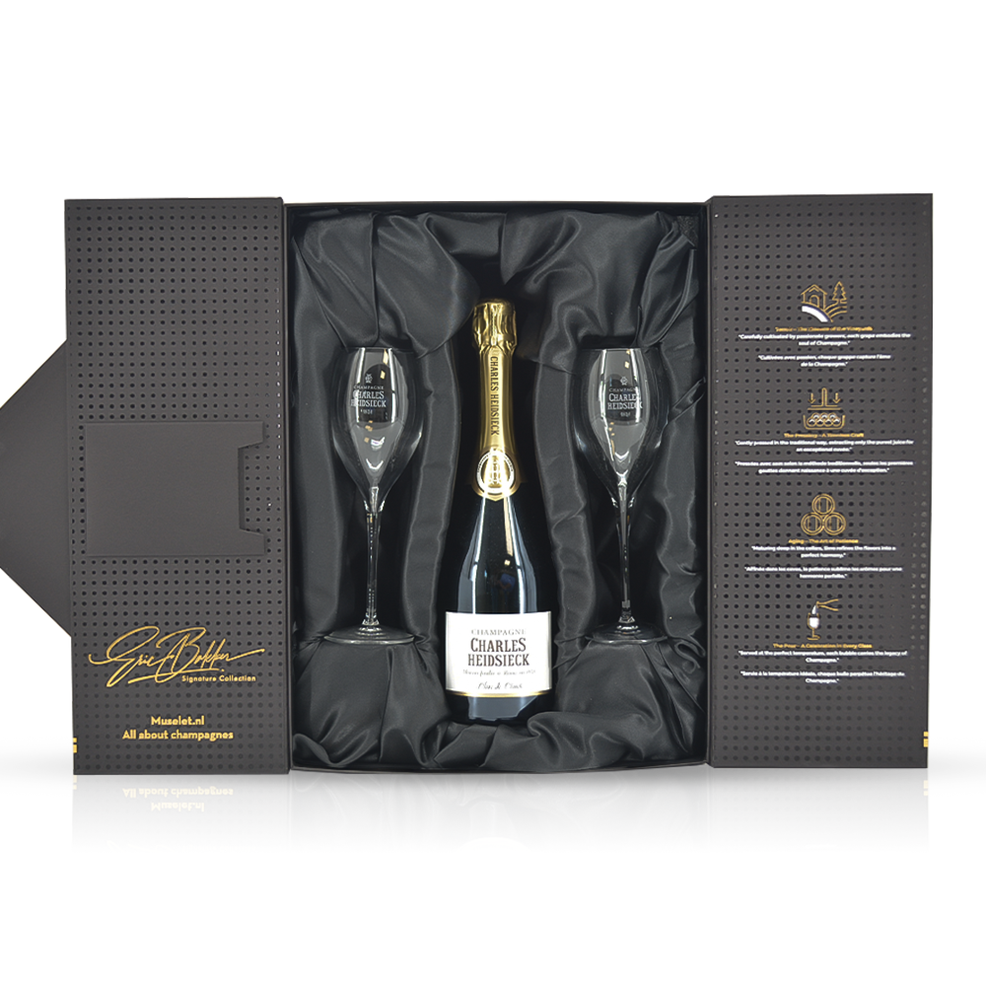 Deze prachtige giftbox bevat naast een fles Blanc de Blancs twee elegante bijpassende glazen. Zo geeft u niet alleen een pracht-Champagne, maar zelfs een complete Champagne-ervaring cadeau. De perfecte verwennerij voor iedere wijnliefhebber!